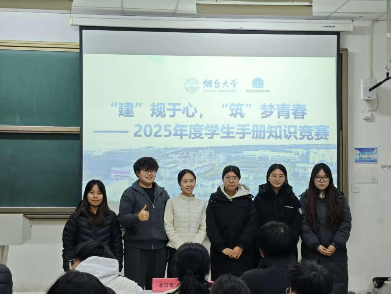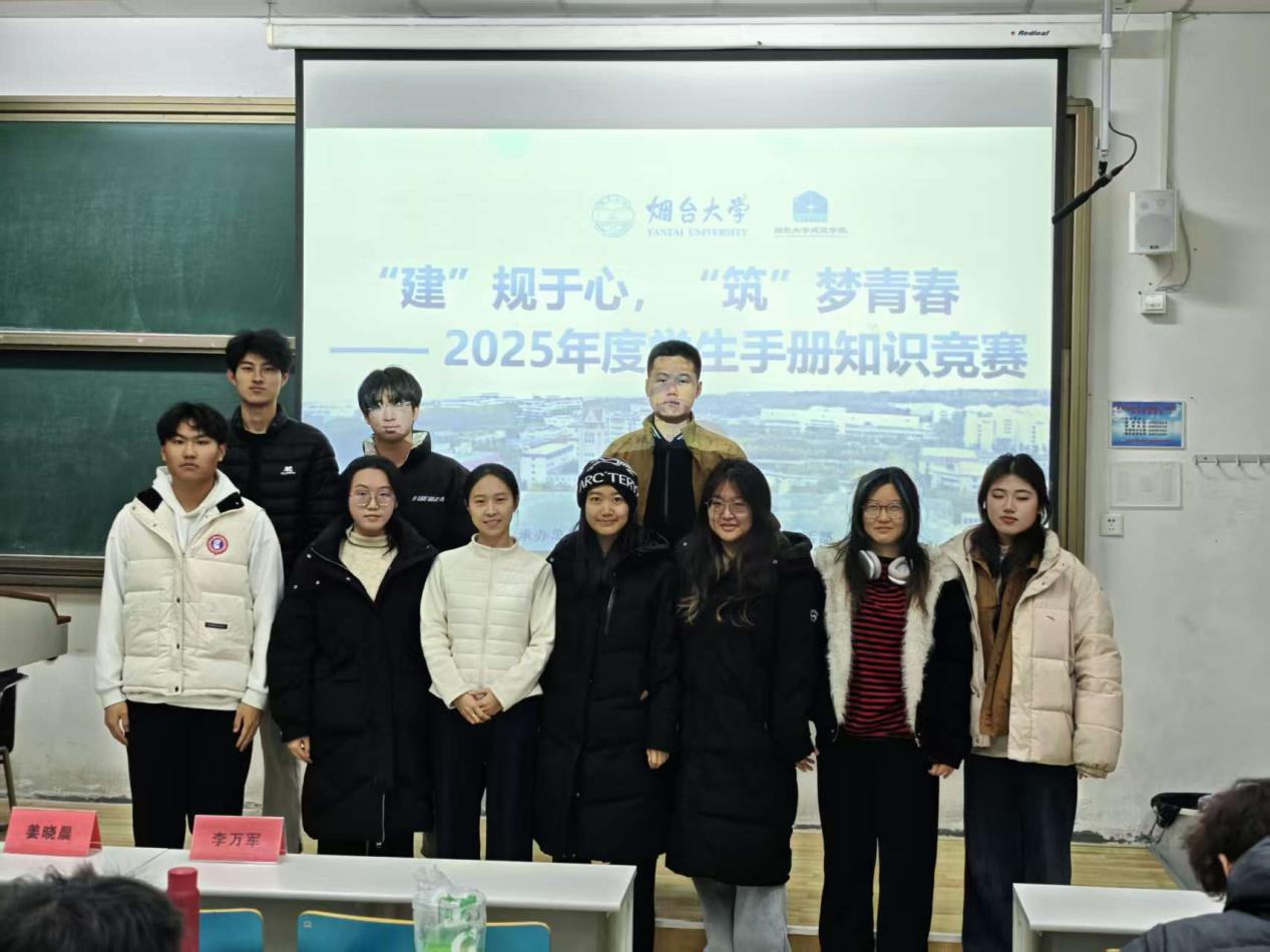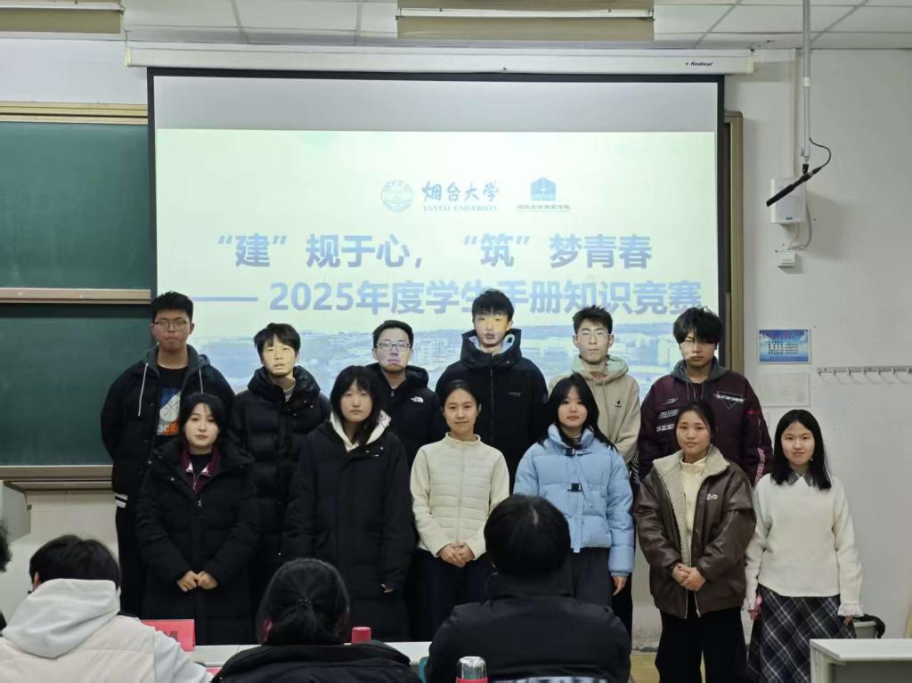 为深入贯彻立德树人根本任务,营造“知规则、守规矩、讲文明”的校园文化氛围,建筑学院于12月24日在综合楼302教室顺利举办2025年度学生手册知识竞赛。9支参赛队伍同台竞技、各展风采,为现场师生呈现了一场集知识性、竞技性与教育性于一体的青春盛宴。