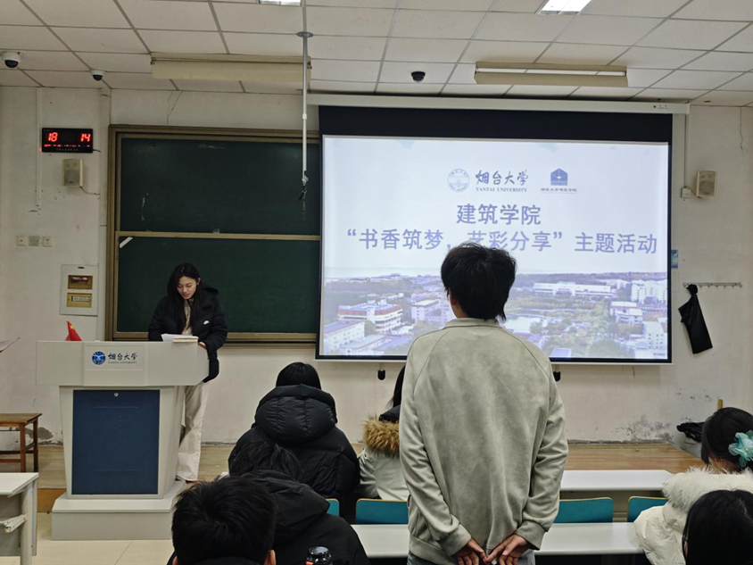 为帮助同学们在书籍中拓宽视野,促进知识与实践相融合,建筑学院学生会于12月26日在综合楼301开展"书香筑梦,艺彩分享"主题活动。